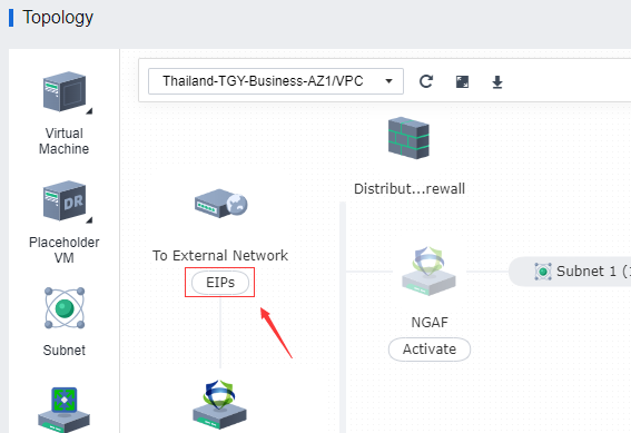 If the VM in the VPC network needs connect to the external network should Bind elastic IP Select Networing > Topology click EIPs.