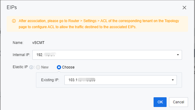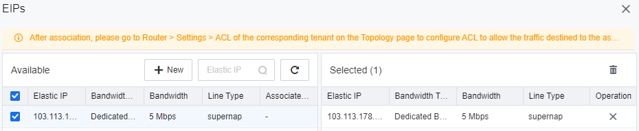 Select the available Elastic ip (if there is not available EIP you can click New Add New Elastic lP ) then click OK to confirm.