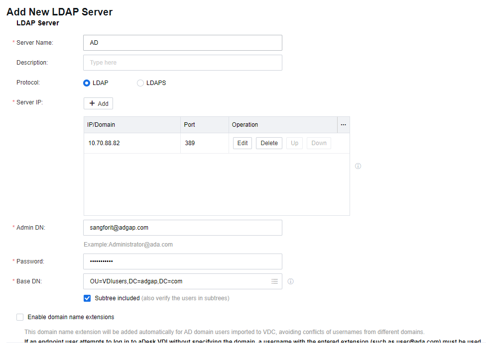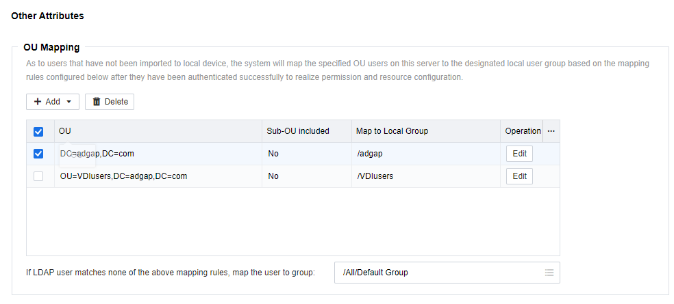 For users who have not been imported to the VDC, after successful authentication, the system will map the specified OU users on the domain server to the designated local user group based on the configured mapping rules to implement the permission and resource configuration. -