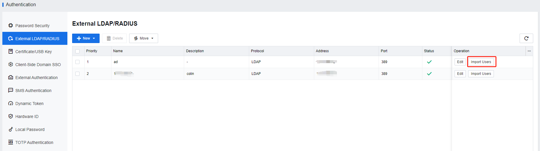 - Log in to the VDC console and navigate to Resources > Services > Authentication > External LDAP/RADIUS. On the External LDAP/RADIUS page, click Import Users.