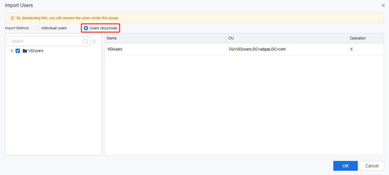 - Click the List icon in the OU field. On the Import Users page, select Users recursively, and click OK.