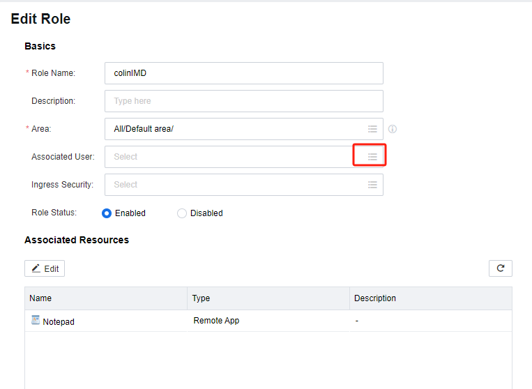 - Log in to the VDC console. Go to Resources > Services > Roles, and click Edit to edit the corresponding role. On the Edit Role page, modify the configurations in the Basics and Associated Resources sections as required.