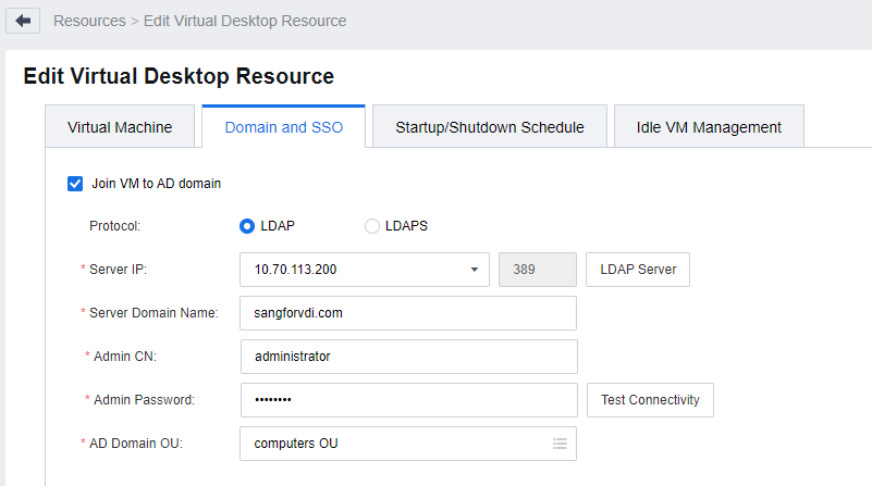 On the Domain and SSO tab, select the Join VM to AD domain checkbox, set Server IP, Server Domain Name, Admin CN, and Admin Password, and then click Test Connectivity. Alternatively, select a domain server that has been integrated with VDC to have the relevant information automatically filled.