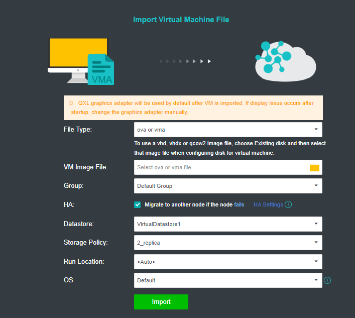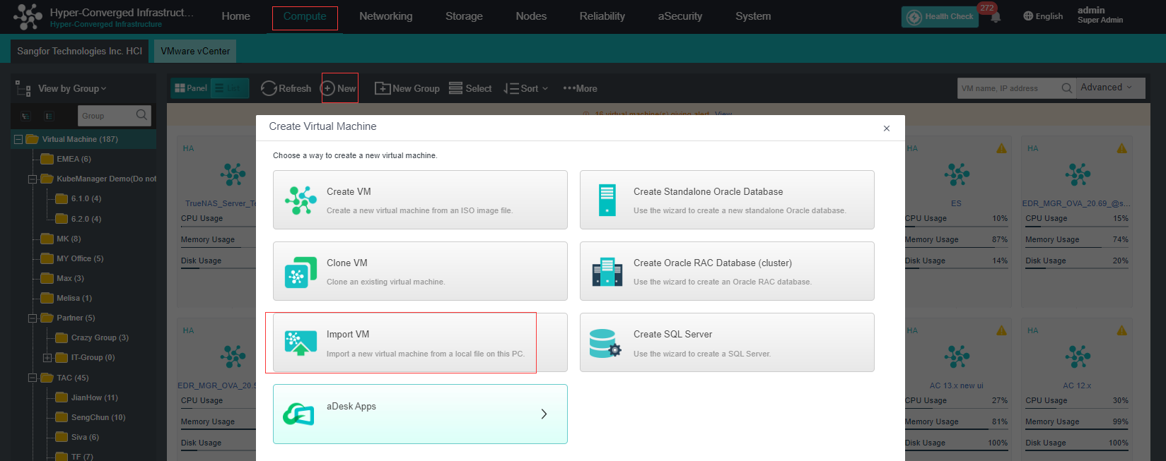 - On the Hyper-Converged Infrastructure (HCI) console, navigate to Compute > Sangfor Technologies Inc. HCI and click New. On the Create Virtual Machine page, click Import VM to import a VM.