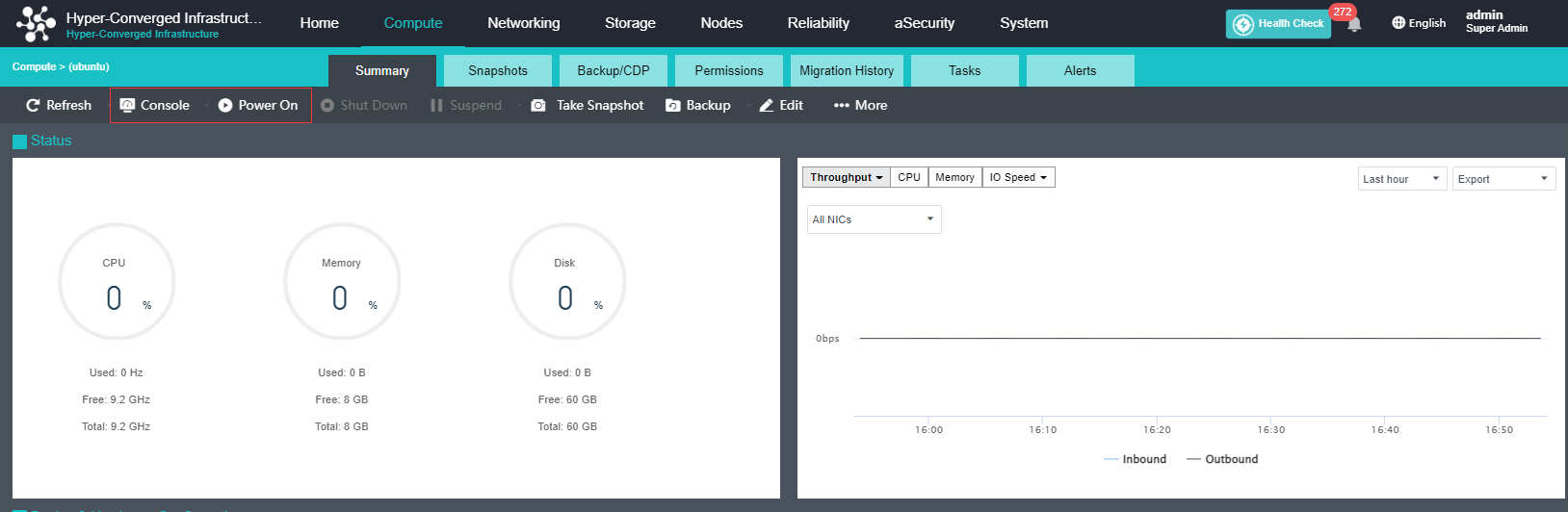 - After the VM is imported, click Summary. On the Summary tab, click Power On to start the VM and click Console to enter the VDC VM console.