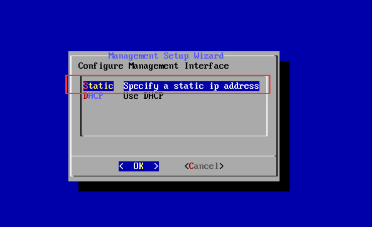 - On the Management Setup Wizard screen, select Static Specify a static ip address and OK, then press Enter.