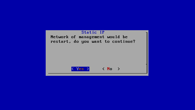 - On the Static IP screen, select Yes to restart the management network for the static IP address configured in the preceding step to take effect.