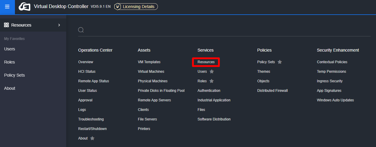 - Log in to the VDC console and navigate to Resources > Services > Resources.