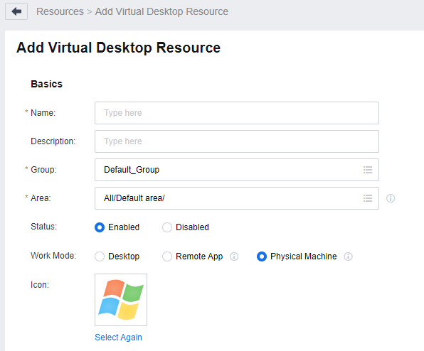 - Complete the settings in the Basics section as required and set Work Mode to Physical Machine.