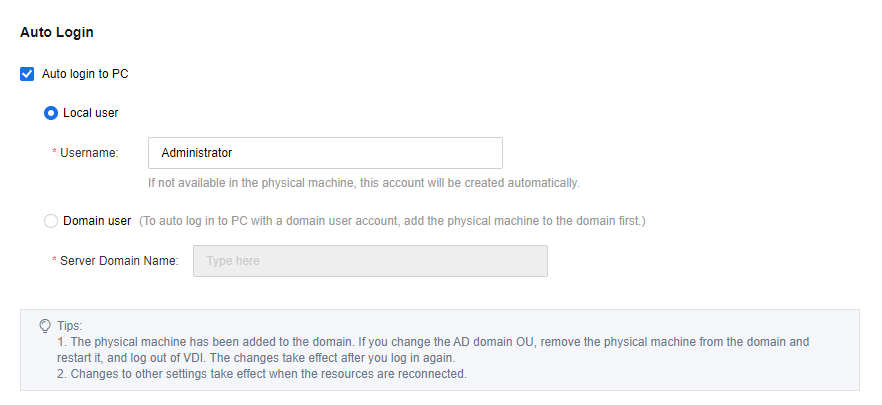 Auto login as domain users can be enabled to ensure that the domain policies apply to domain users when the managed physical machines join the domain. A domain user account consistent with the VDI account is required to log in to the virtual desktop. Administrators need to enter the domain name used for auto login.Auto login as domain users can be enabled to ensure that the domain policies apply to domain users when the managed physical machines join the domain. A domain user account consistent with the VDI account is required to log in to the virtual desktop. Administrators need to enter the domain name used for auto login.