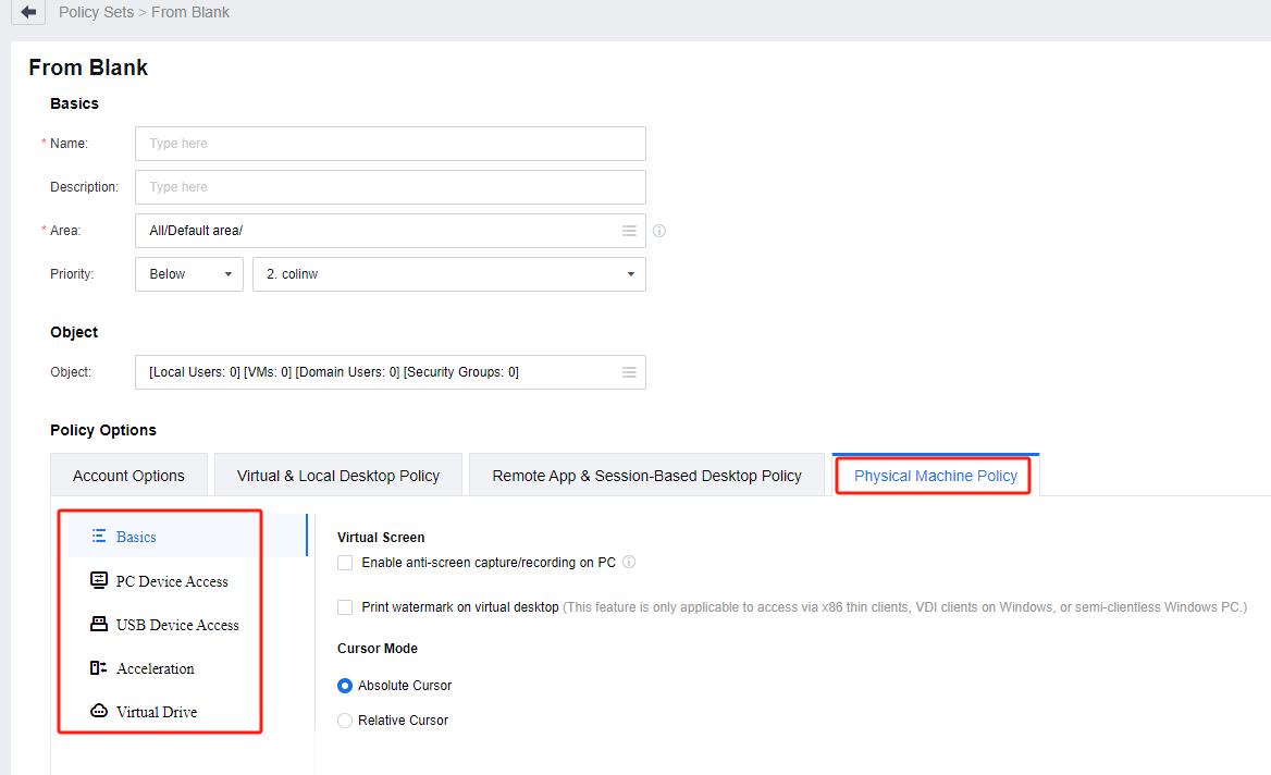 - On the From Blank page, complete the settings in the Basics and Policy Options sections as required. Then click Save.