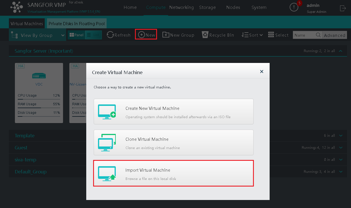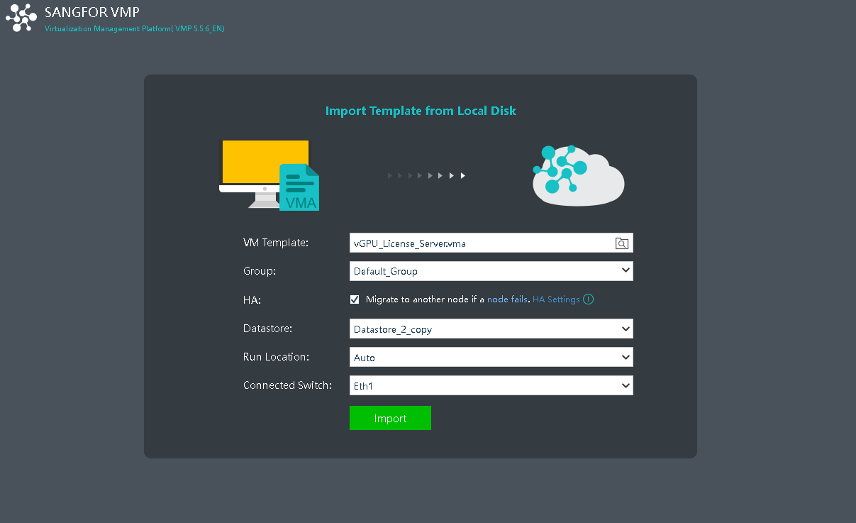 - Login to VMP, go to Compute > New > Import Virtual Machine to import the NVIDIA DLS v3.2.0 license server.