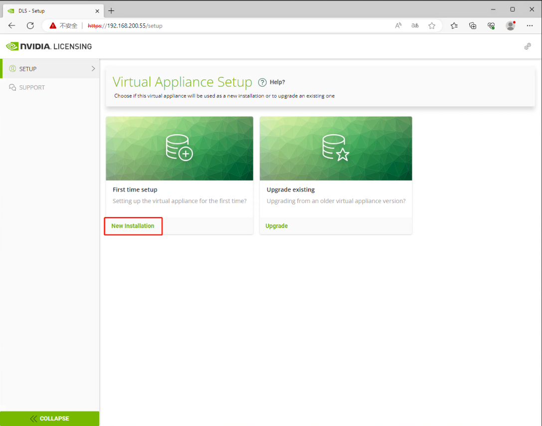Open the browser and enter https://license_server_IP to access the license server WEB console. Then select New Installation to enter the administrator account registration page.