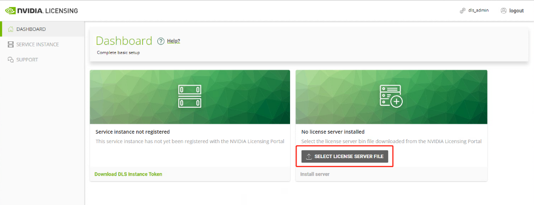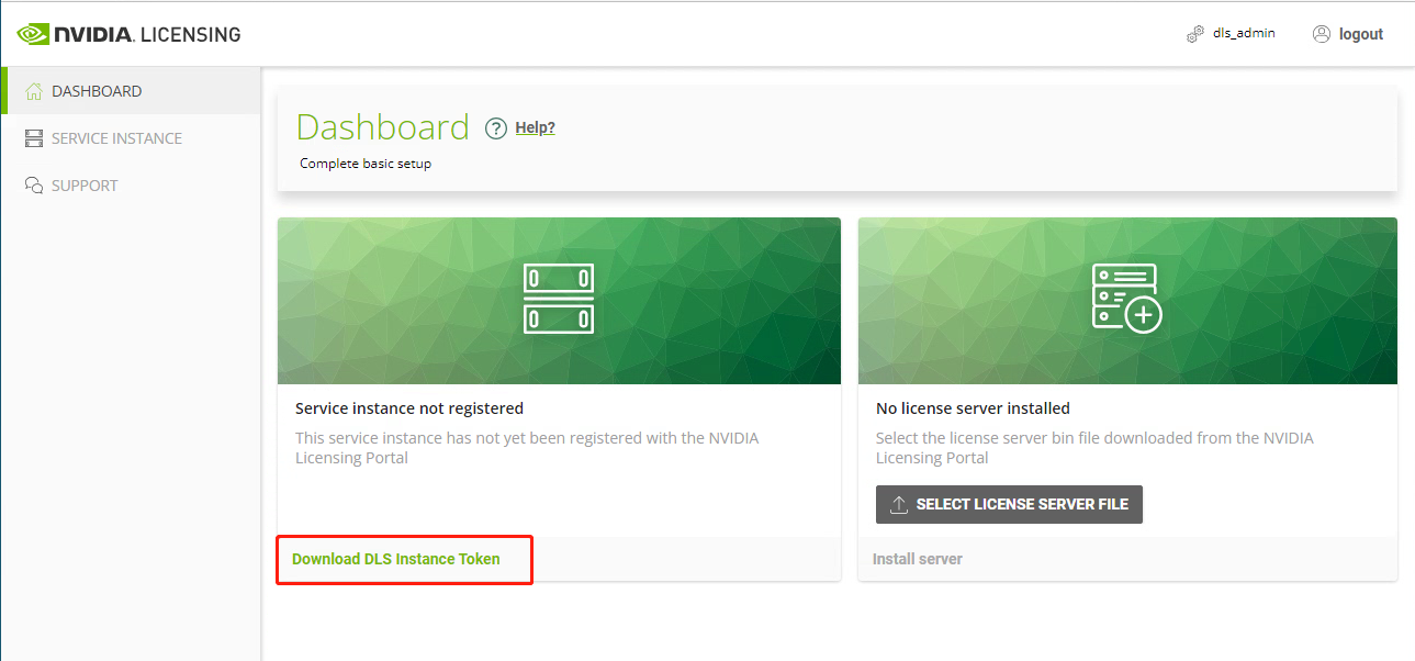 - Select Download DLS Instance Token to download and save this license server’s DLS instance token file. Next, upload it to the NVIDIA official website to register the license server.