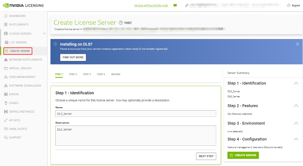 - Log into the NVIDIA enterprise portal at and go to LICENSE SERVER > CREATE SERVER. Fill in the name and description of the authorized server to be created, and then click N**EXT STEP**.