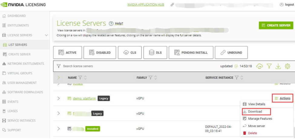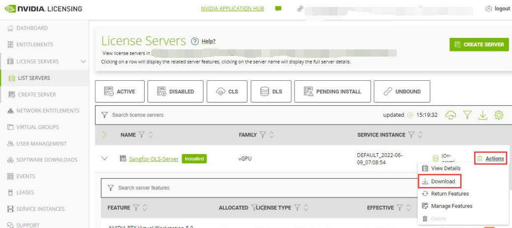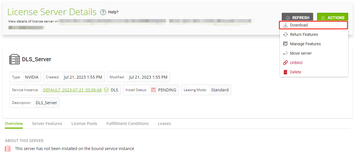 - After the creation is complete, it will automatically jump to the License Server Details page, click the ACTIONS button in the upper right corner, and select Download.