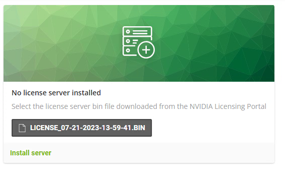 - Select the license BIN file downloaded at the above step, and click Install Server to complete the deployment and activation of the DLS license server.