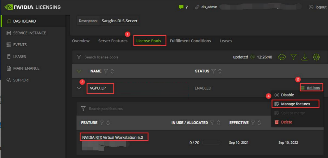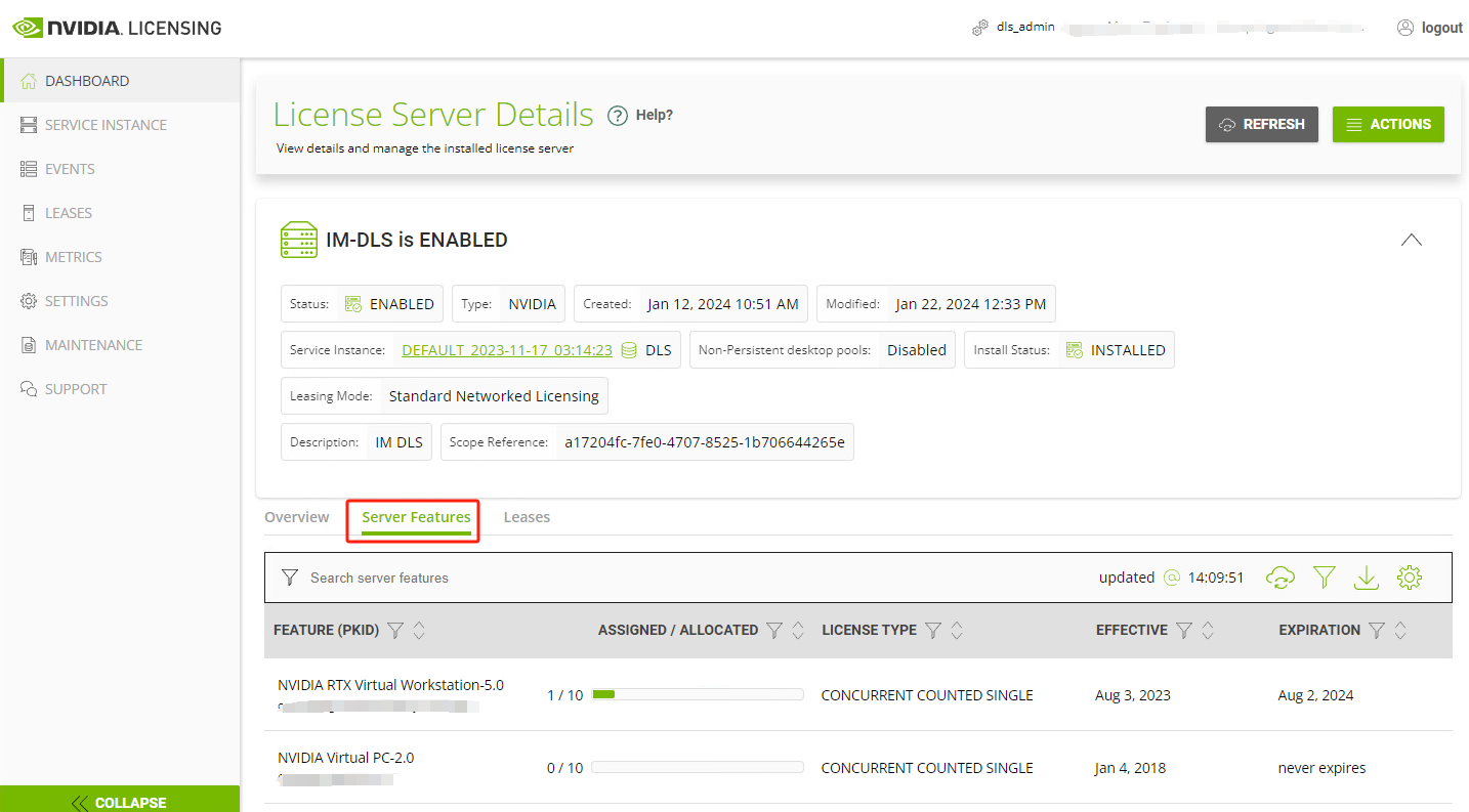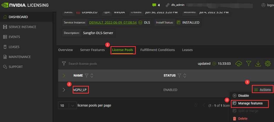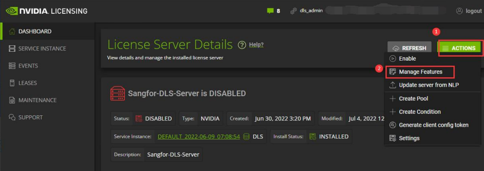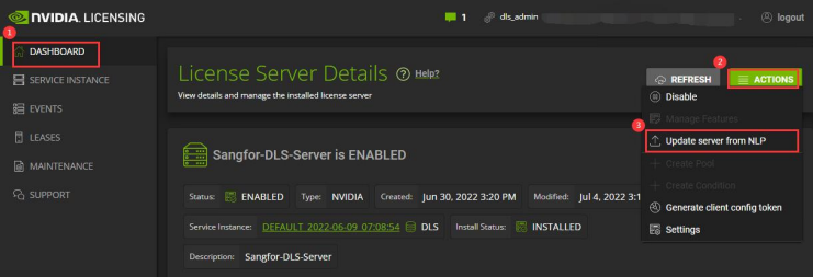 - Log in to the WEB console of the DLS Nvidia server, go to DASHBOARD > ACTIONS > Update server from NLP corresponding to License Server Details.