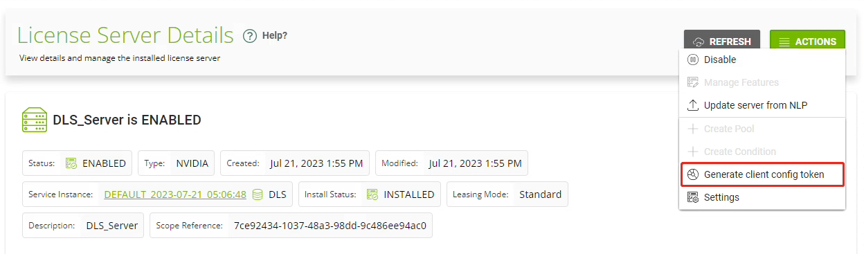- Log in to the WEB console of the DLS Nvidia server, and go to ACTION**S > Generate client config token**.