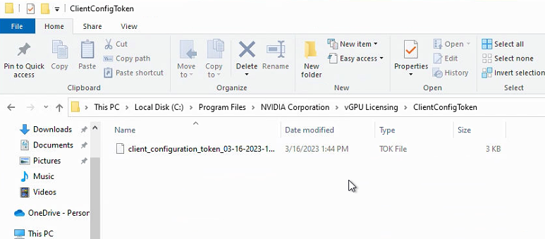 - Access the template or derived VM, and put the Client Configuration TOKEN file into the C:\Program Files\NVIDIA Corporation\vGPU Licensing\ClientConfigToken.