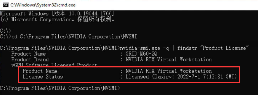 **cd C:\Program Files\NVIDIA Corporation\NVSMI****nvidia-smi.exe -q | findstr “Product License”**