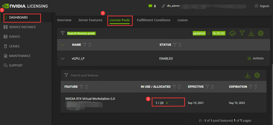 - Log in to the WEB console of the DLS Nvidia server, and go to the DASHBOARD > License pools. Click on the license pool, it will show the usage of various licenses.