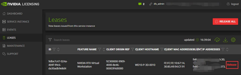 - Go to LEASES to view the list of online clients and occupation license types. Click the Release button to release the specific client license occupation.