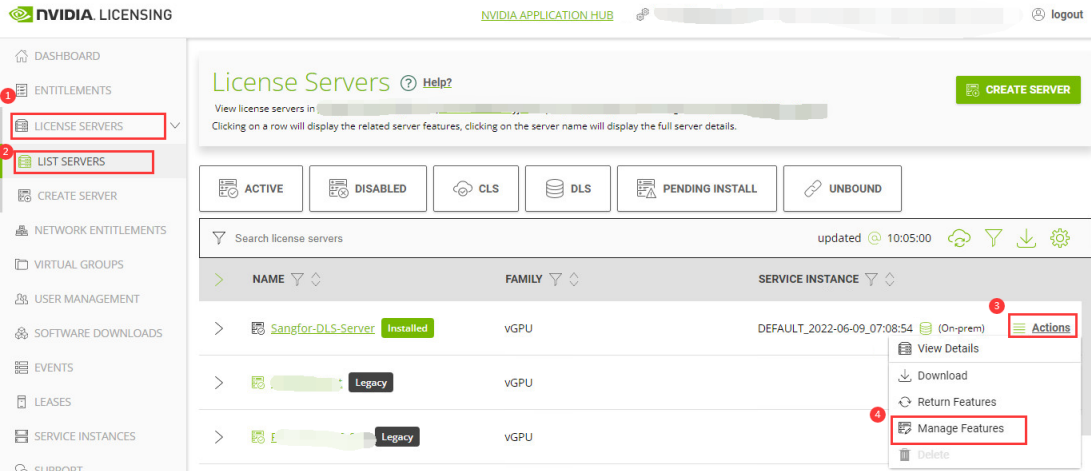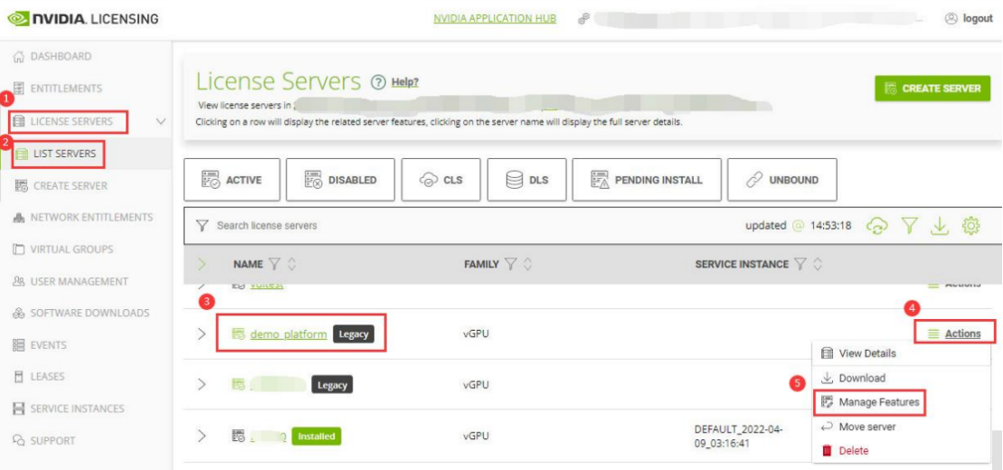 - Login to the Nvidia Application Hub portal (). Go to LICENSE SERVERS > LIST SERVERS and find the license server. Click Actions > Manage Features to enter the Manage Server Features pages.