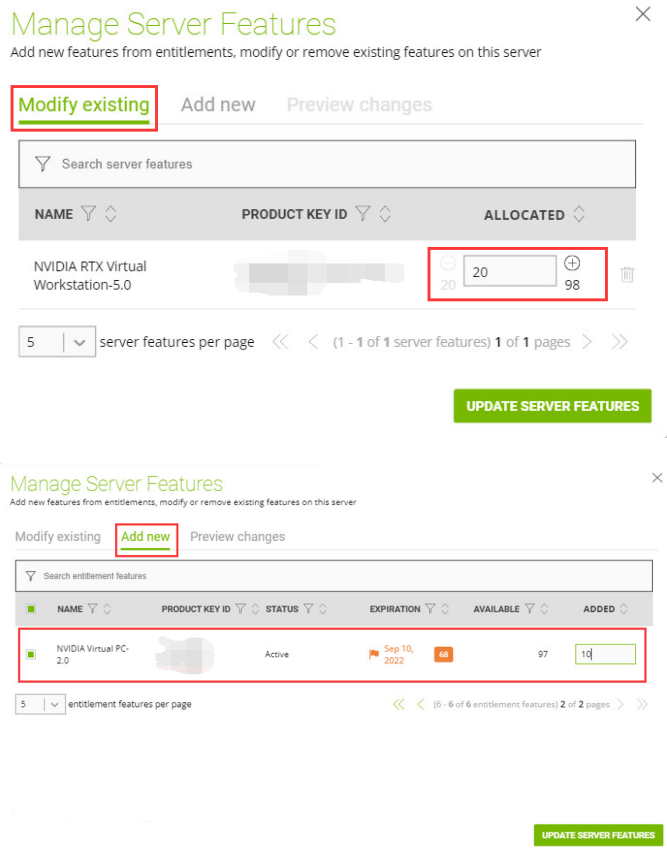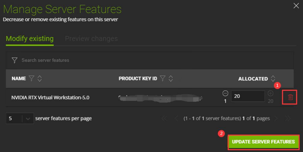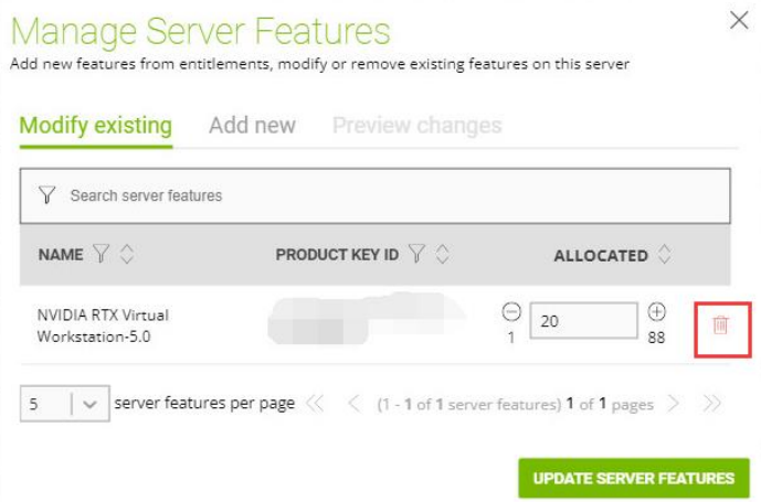 - In the Modify existing tab, delete the license to be reclaimed and click UPDATE SERVER FEATURES button to complete the license reclaim.