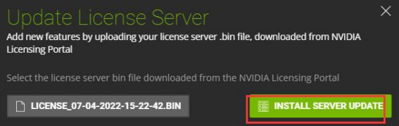 - Select the new license BIN file and click INSTALL SERVER UPDATE.