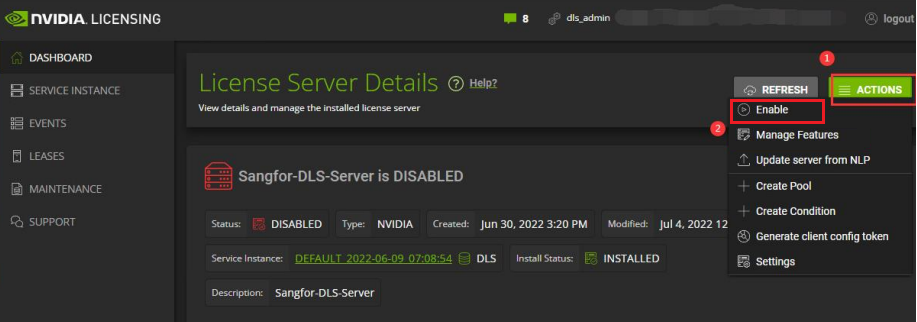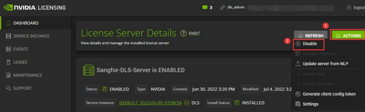 - Log in to the WEB console of the DLS Nvidia server, go to DASHBOARD > ACTIONS > Disable and click the DISABLE SERVER button to stop the license server service.