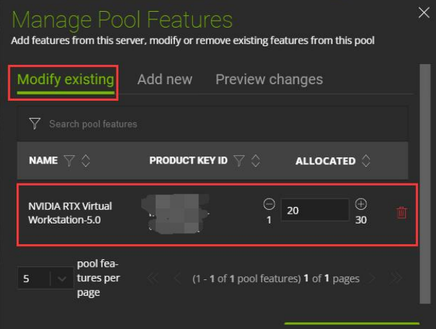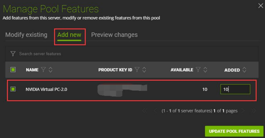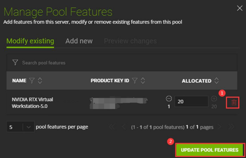 - In the Modify existing tab, delete the license to be reclaimed and click UPDATE POOL FEATURES button to complete the license pool reclaim.