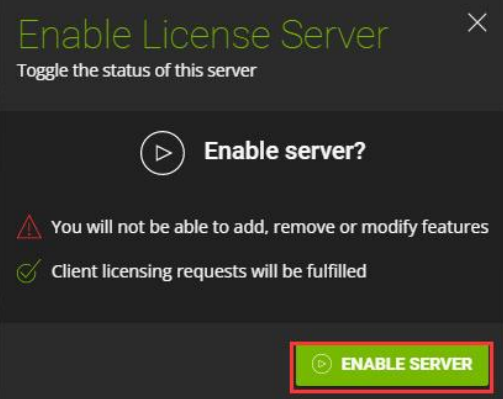 - Go to DASHBOARD > ACTIONS > Enable and click the ENABLE SERVER button to restore the license server service.