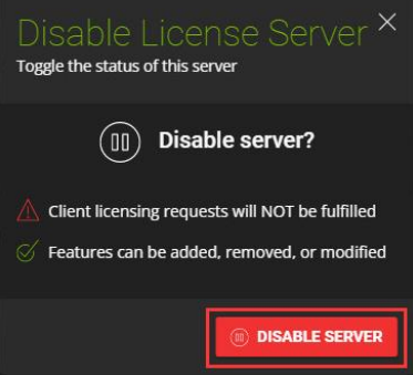 - Go to DASHBOARD > ACTIONS > Disable and click the DISABLE SERVER button to stop the license server service.