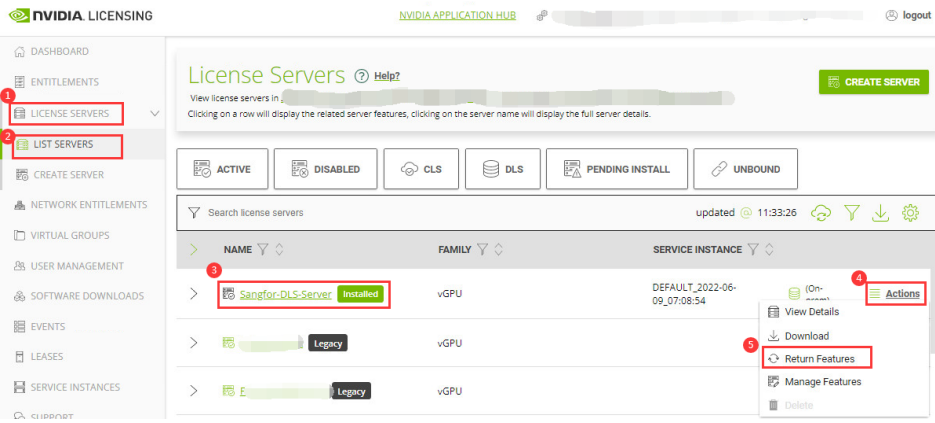 - Login to the Nvidia Application Hub portal, select the license server to be reclaimed and click the Actions > Return Features button.