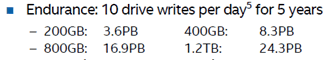 The corresponding lifetime of a 200GB SSD over a five-year lifespan is 3600TB, which averages out to 3600TB/(5*365) = 1972GB per day, which is 200GB on the disk, and 1972GB equal to 10 writes per day.