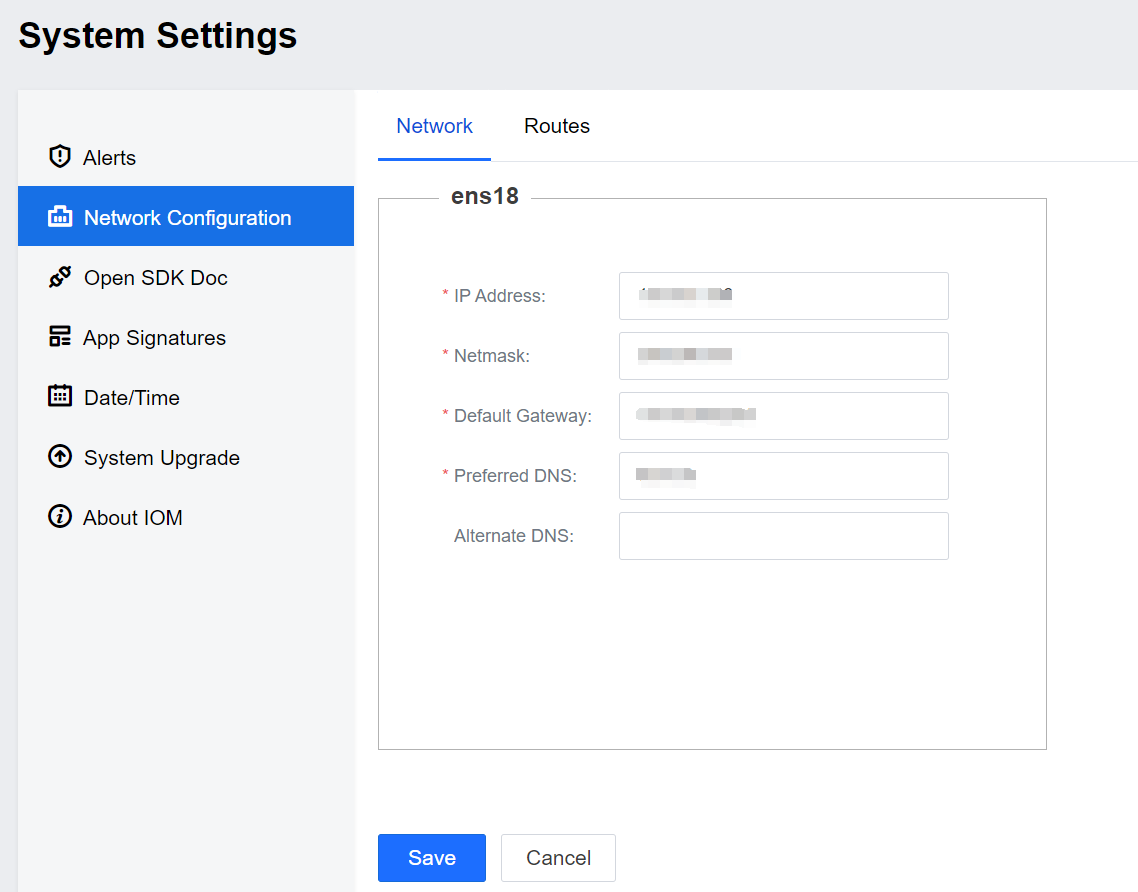 Click System Settings > Network Configuration, and fill in the official IP address, gateway, etc.