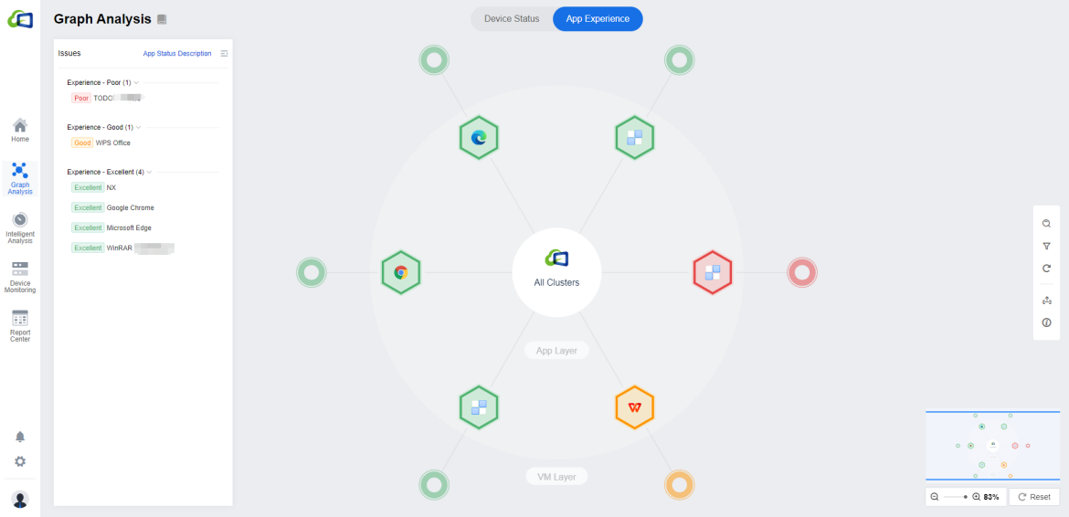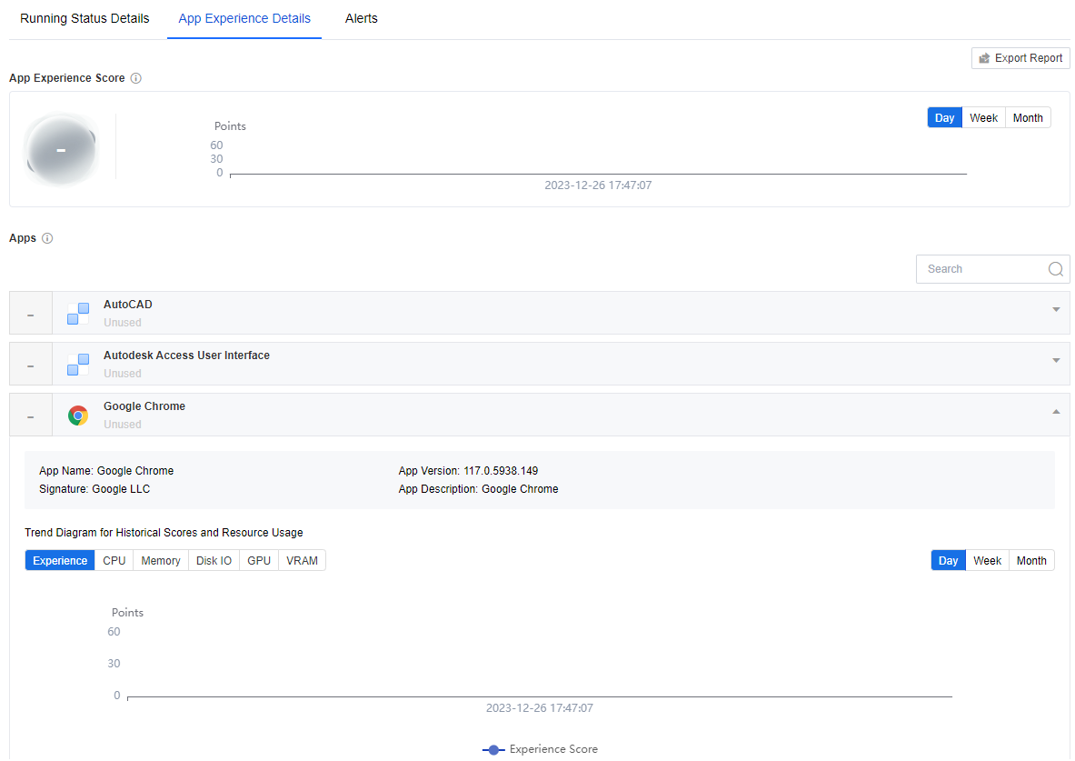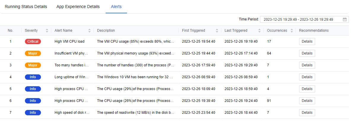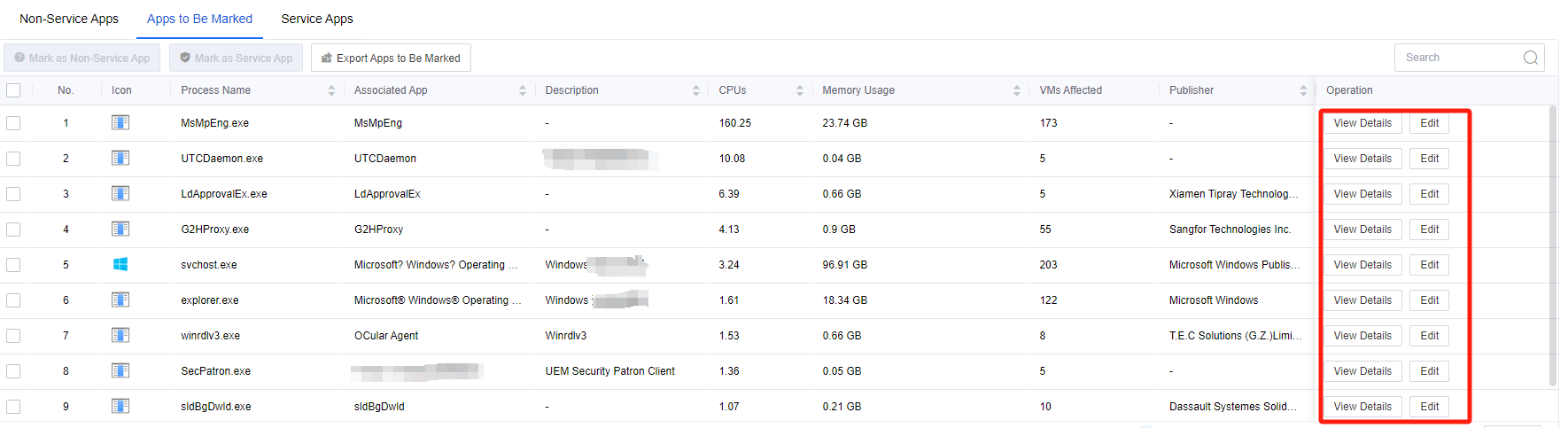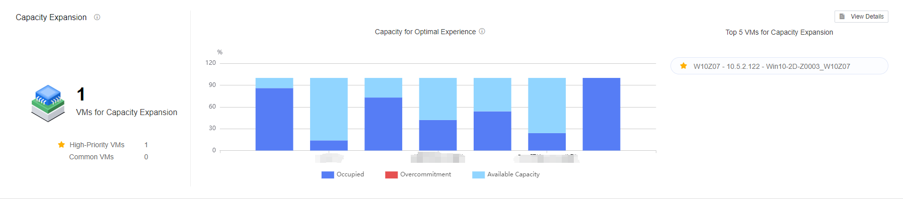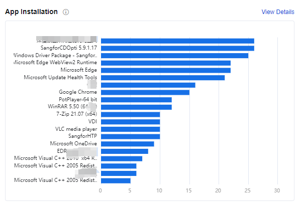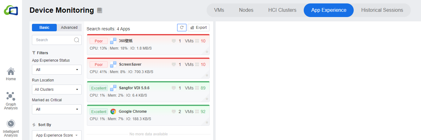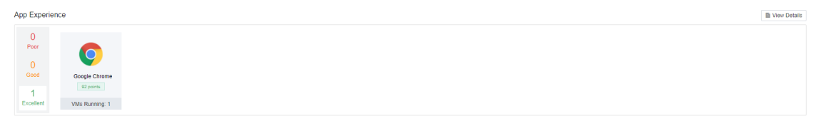 The App Experience module is based on AI algorithms, plus a collection for the usage of VM applications to classify all the applications used within the environment into three categories: Excellent, Good, and Poor. It also shows the number of VMs running the application in the environment now. Click View Details to show the details of the application.