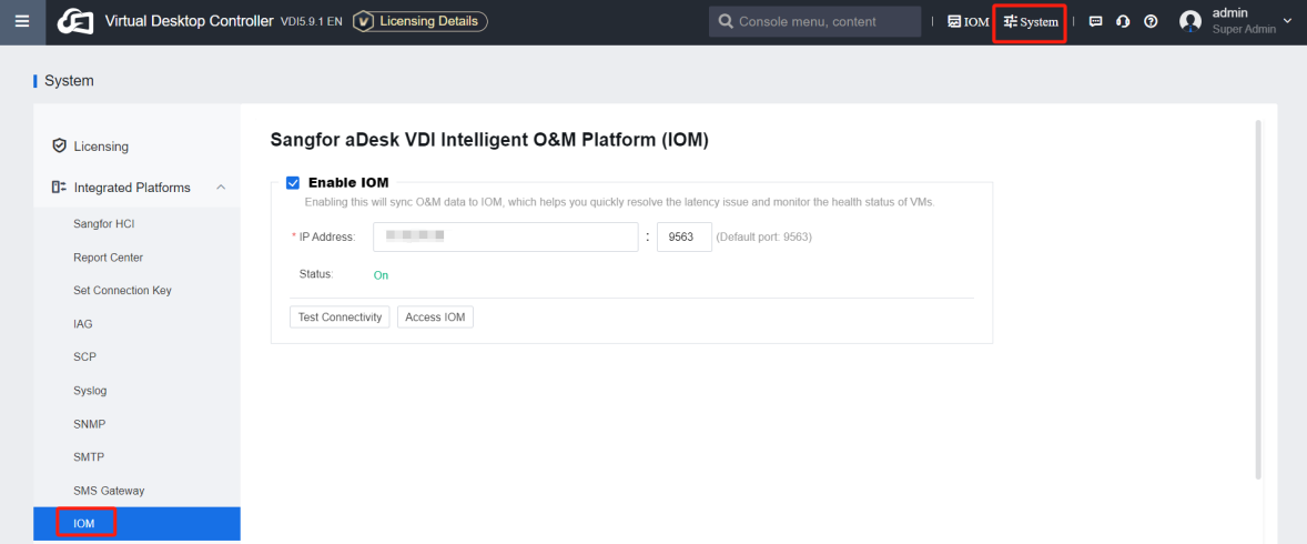 Log in to VDC. Navigate to System > Integrated platform > IOM for integration, as shown below.