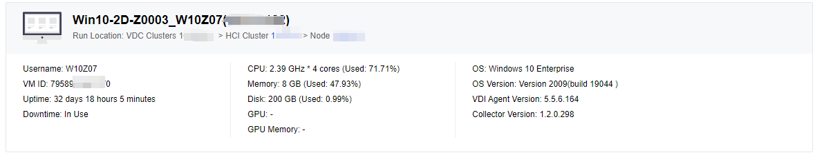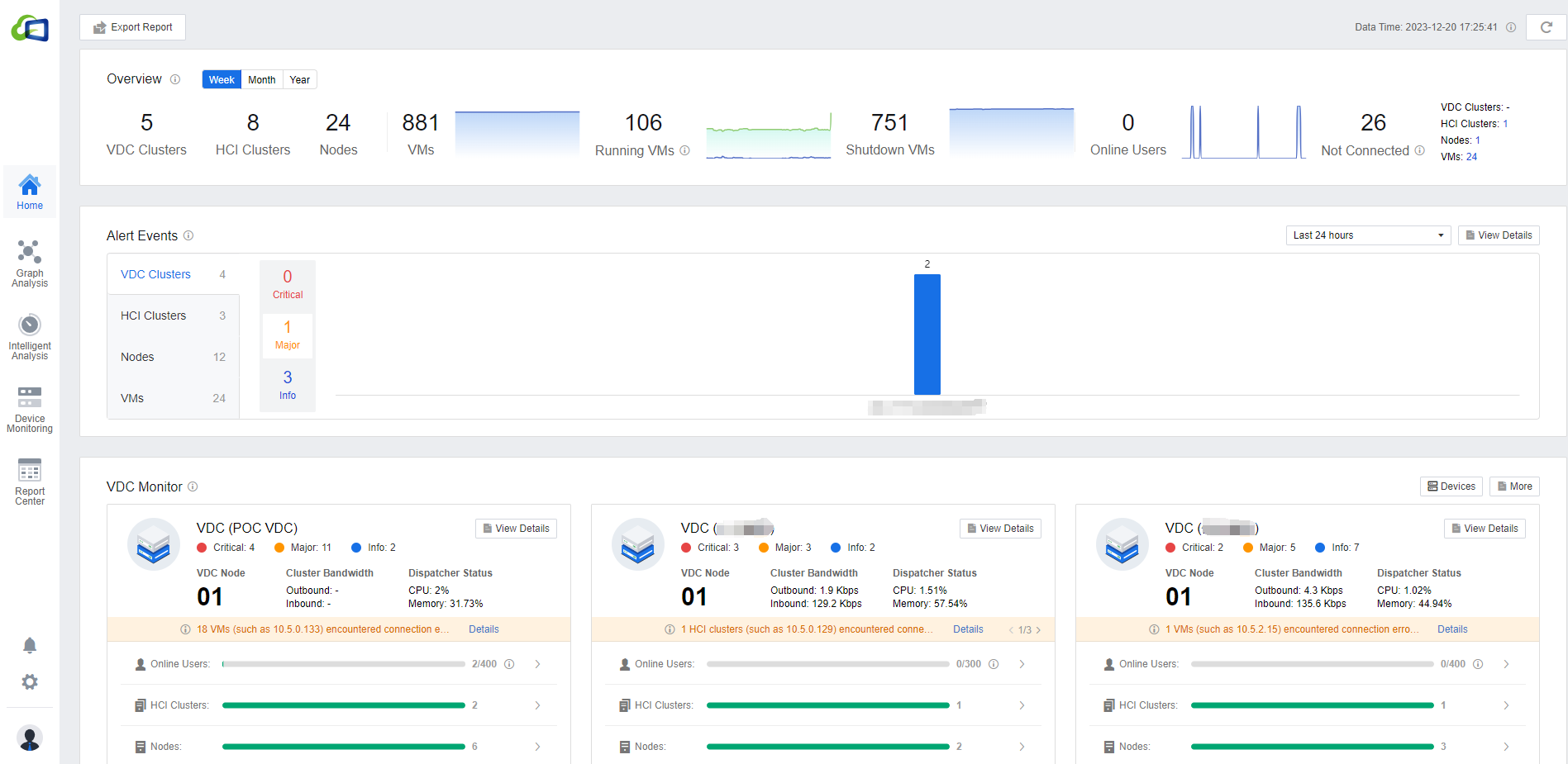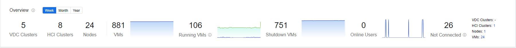 The overview allows you to see the number of VDC/HCI clusters currently connected, the number of nodes, the number of virtual machines, as well as the number of virtual machines switched on and off, and the number of online users with unconnected VDC/Virtual Machines/clusters/nodes. Administrators can quickly navigate to the current utilization of the desktop environment on the Homepage.