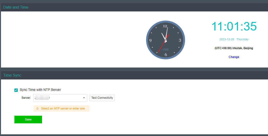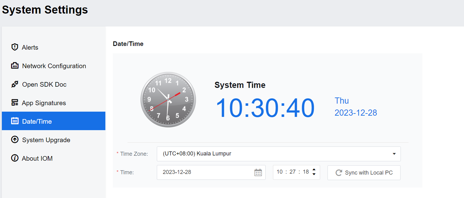 You can set the IOM system’s Time and Time Zone on this page. It also supports Sync with Local PC.