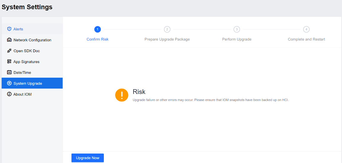 - After the upgrade, restarting the service takes about 10 minutes. During these 10 minutes, access to the IOM may be unstable.