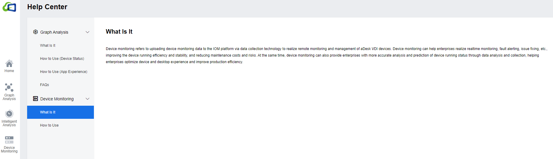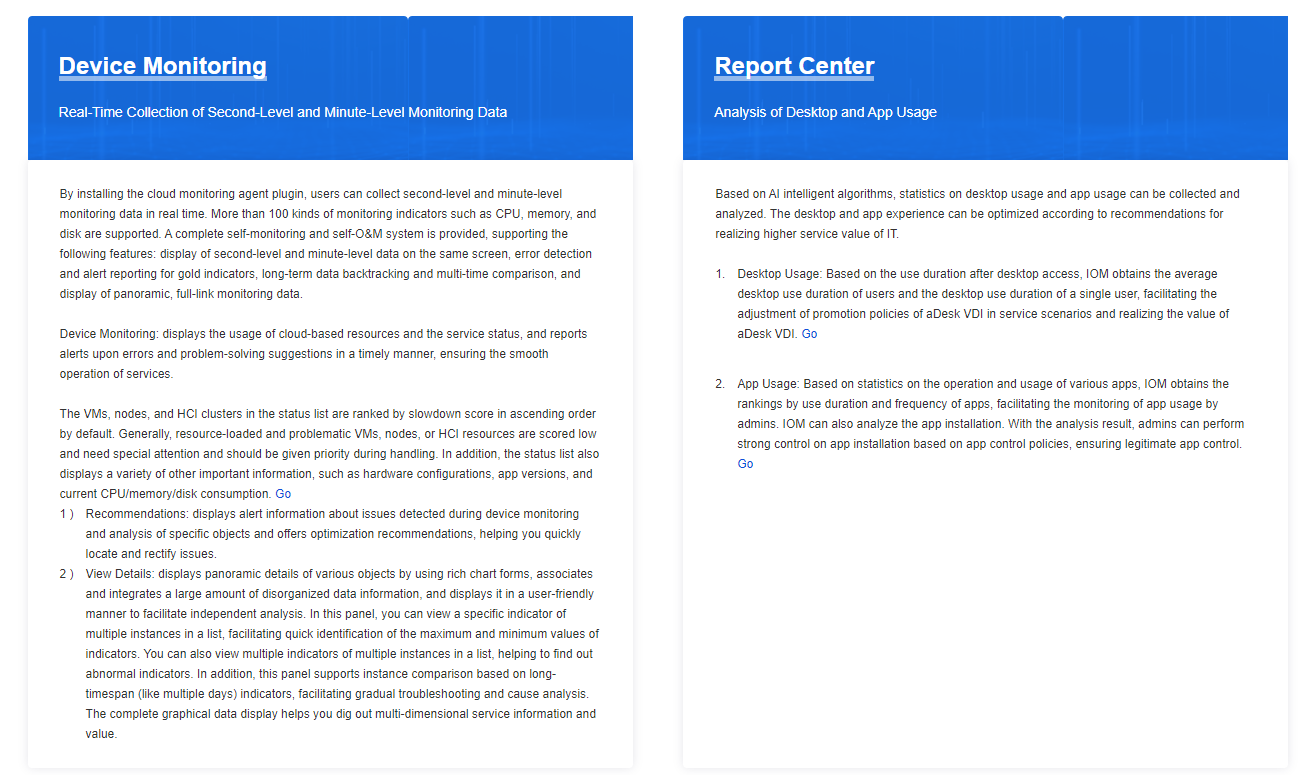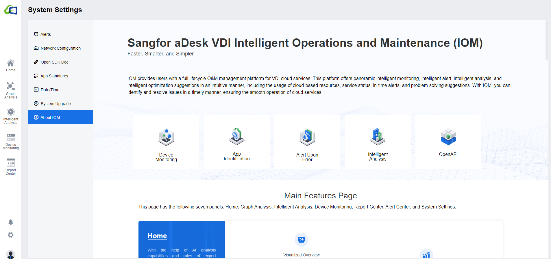 IOM stands for Intelligent operation and maintenance (IOM), and we have designed, developed, and upgraded Sangfor aDesk Virtual Desktop Infrastructure(VDI) Intelligent Operations and Maintenance based on this core concept.