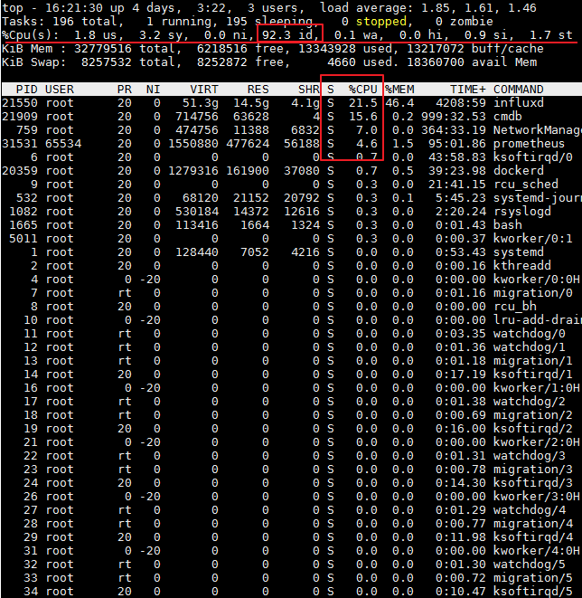 Check whether the CPU load is too high. The higher the value before the id, the lower the load.