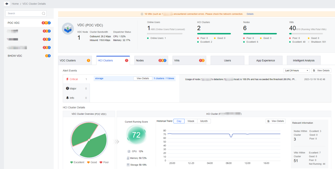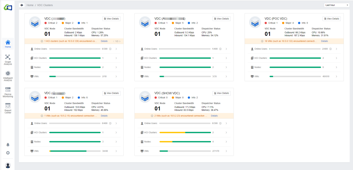 VDC monitoring can provide the number of Online Users, HCI Cluster, Nodes, and VMs for each cluster. You can also see the outbound/inbound bandwidth and CPU/memory of the VDC. Click the View details button to view the overall environment utilization alerts from the VDC cluster perspective.