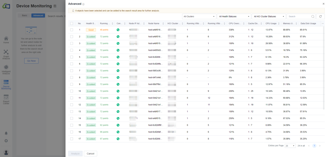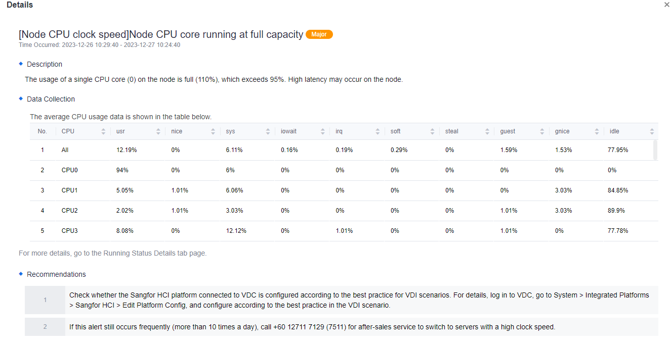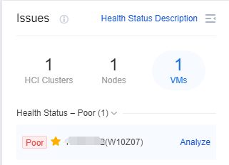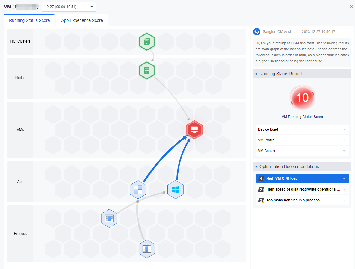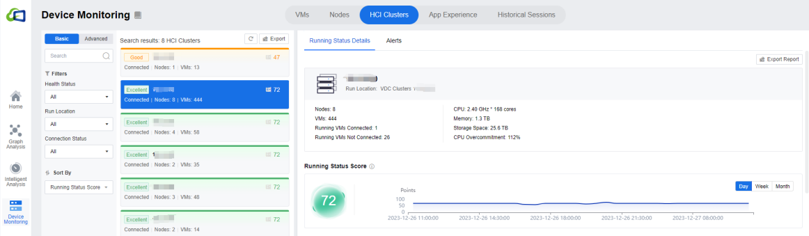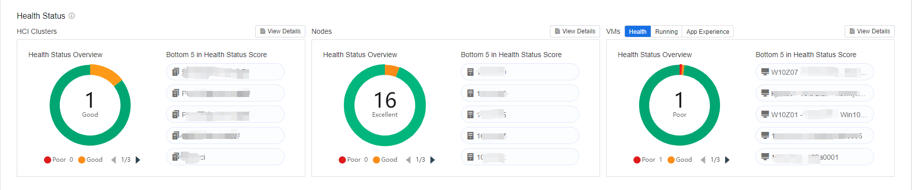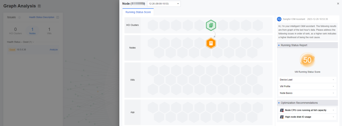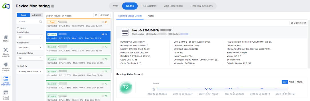 The health status module includes the load distribution and trend of HCI clusters, nodes, and VMs. It ranks the high-load nodes and VMs according to AI intelligent algorithms, and clicking on the device name can enter the device’s detail page. It also displays last week’s cluster load trend graph to help the administrator manage the clusters, nodes, and VMs.