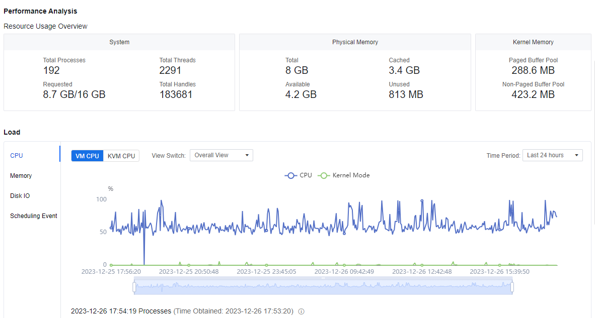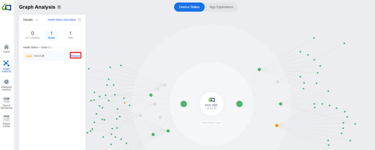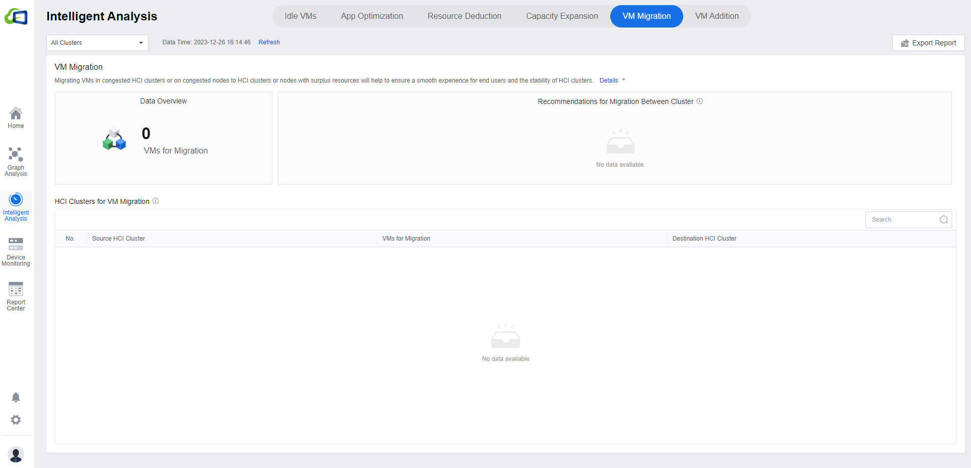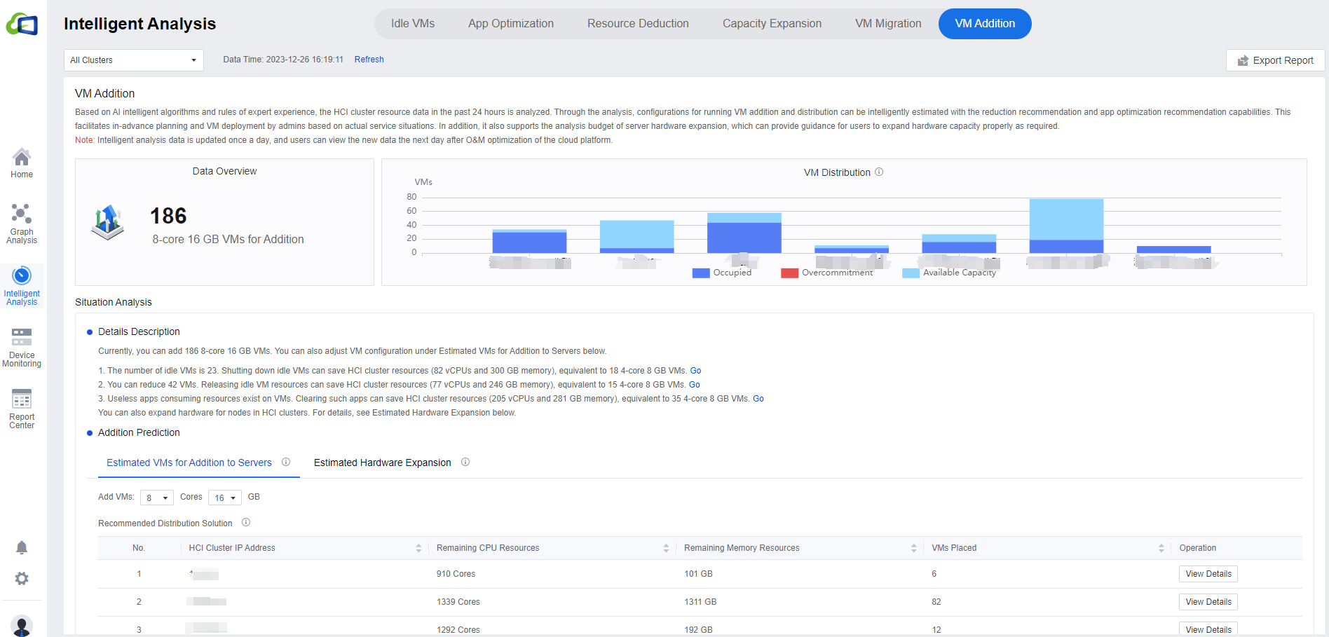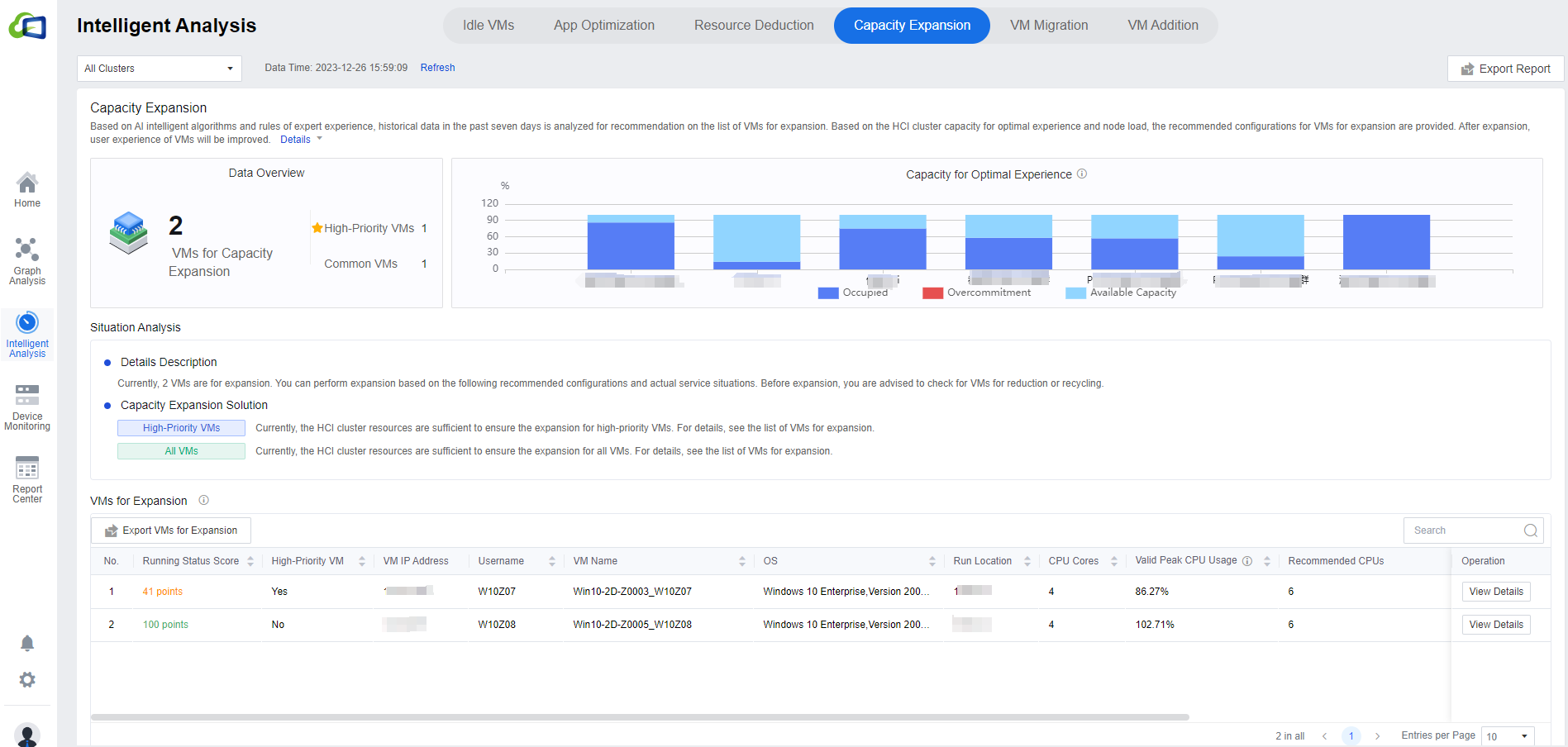 The health status module includes the load distribution and trend of HCI clusters, nodes, and VMs. It ranks the high-load nodes and VMs according to AI intelligent algorithms, and clicking on the device name can enter the device’s detail page. It also displays last week’s cluster load trend graph to help the administrator manage the clusters, nodes, and VMs.