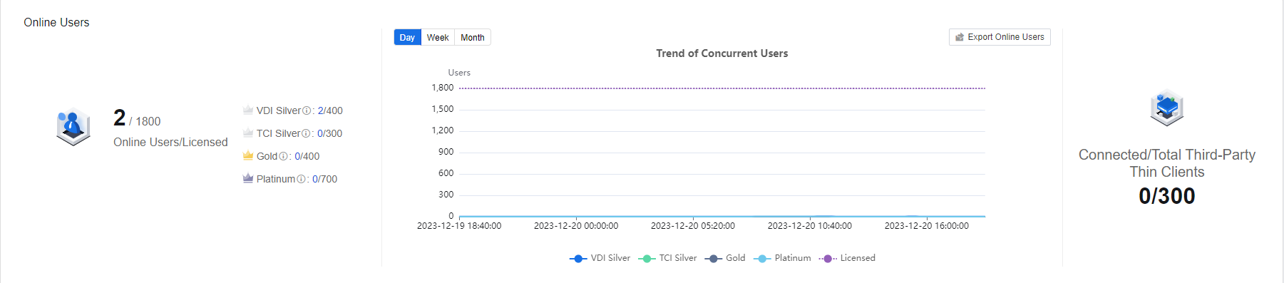 This module allows you to see the IOM-integrated VDC concurrent users. It supports viewing the Trend of Concurrent Users by Day/Week/Month. Click the Export Online Users button to export the list of online users directly.