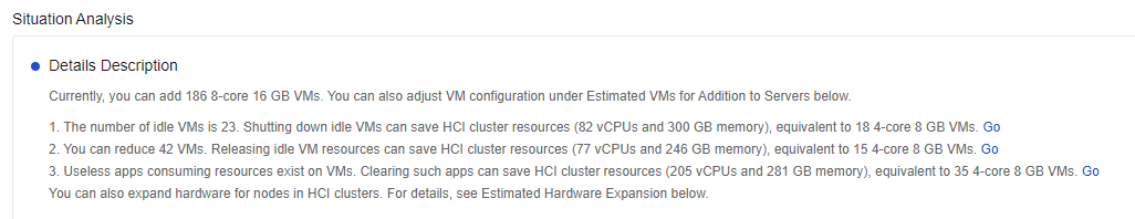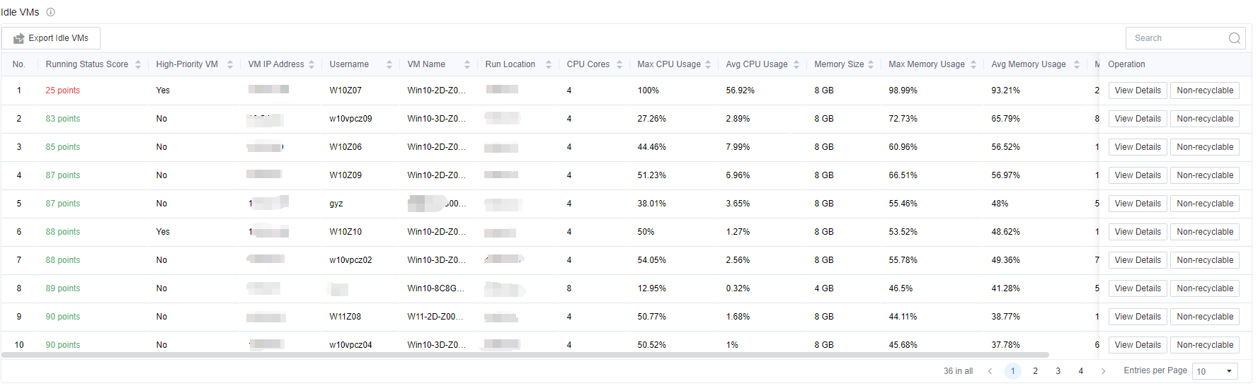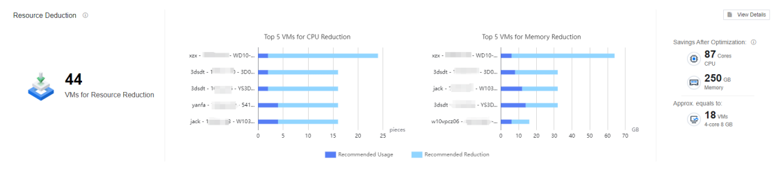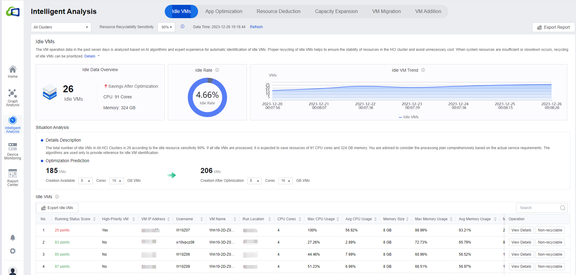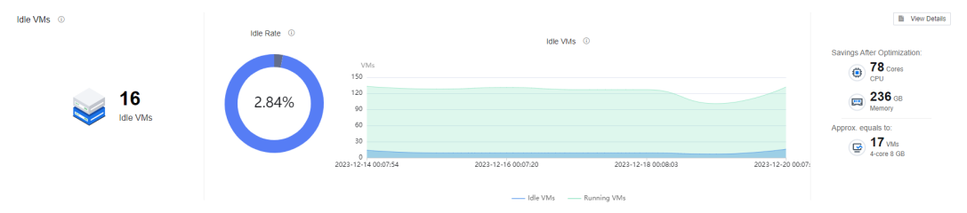 Idle VMs show the total number of idle VMs, the percentage of idle, the trend of the number of idle, and the estimated resource-saving after the optimization.