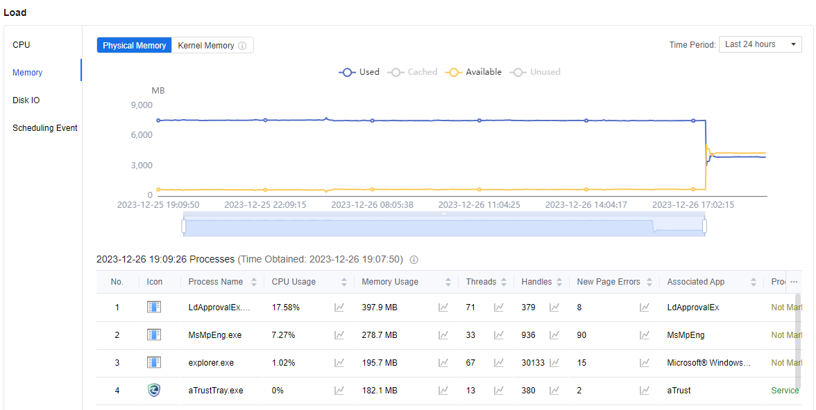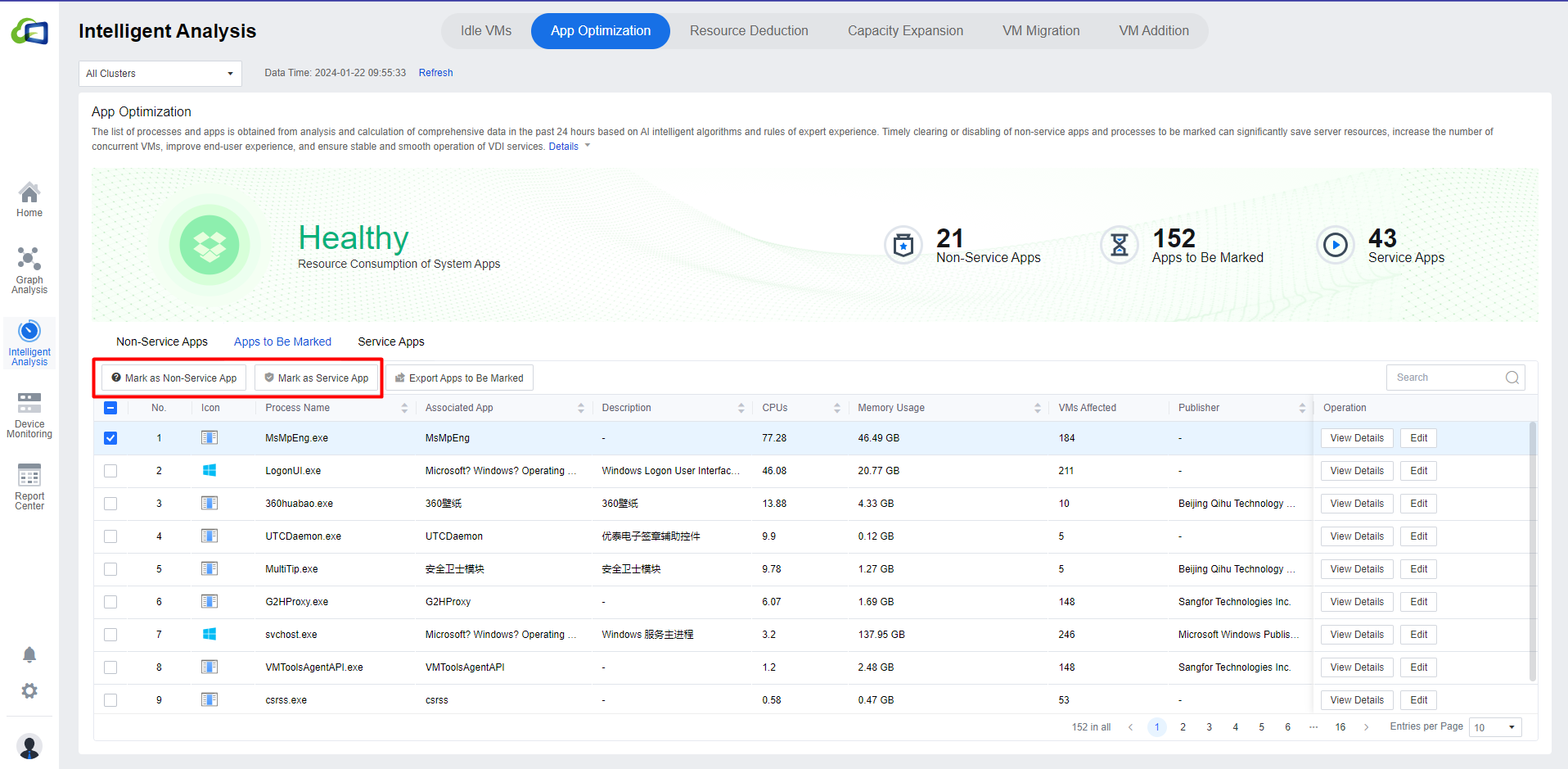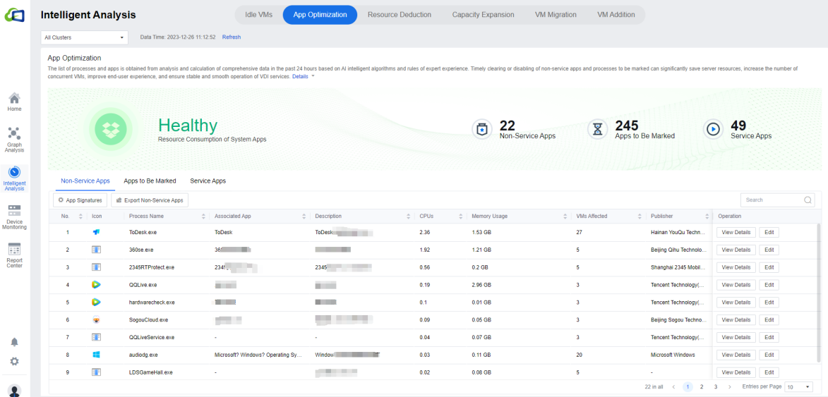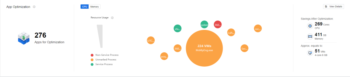 App Optimization shows application details with high resource consumption and resource consumption in CPU and memory in bubble charts, intelligently classifies the application into Service Process, Non-Service Process, and Unmarked Process**, and intelligently estimates the resource-saving after the optimization.
